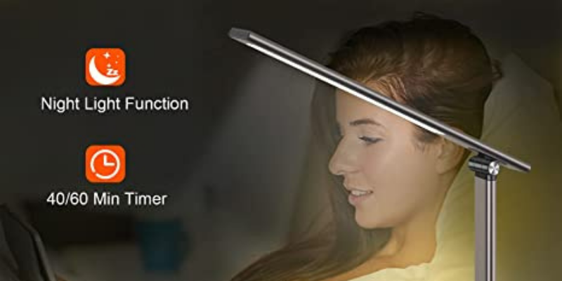 The desk lamp has auto-dimming mode and synchronizes with your room brightness level. Also, it can mimic the colors of the environment. The curved head design allows it to illuminate the whole desk without the glaring risk to your eyes.