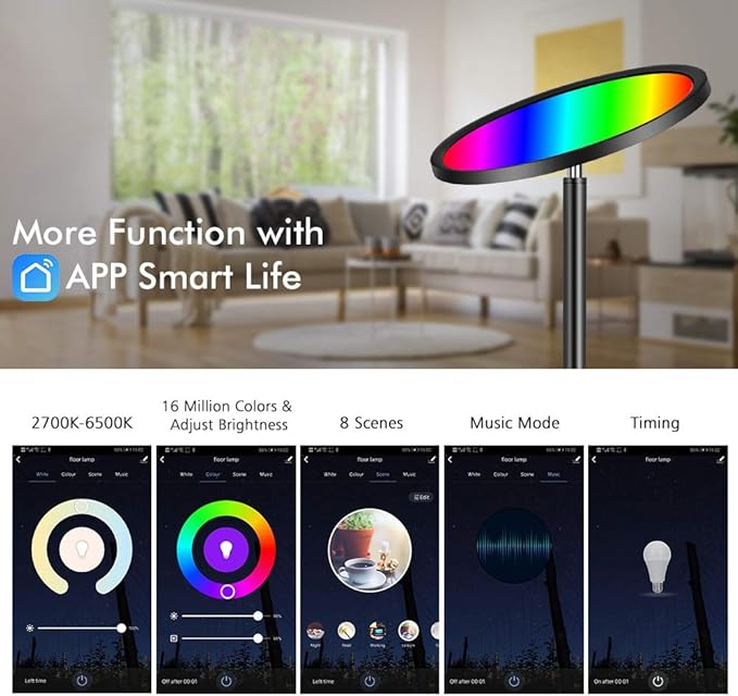 The lamp is a standing pole of the metallic body with a black finish balanced by two right-angled legs at the bottom. It also gives you control over 16 million RGB color options and comes with a smart app.