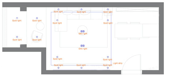 Group the dining room and kitchen spotlights, as well as the ceiling light strips, so that all of the light fixtures in those areas may be managed as a unit. Each of the other luminaires is separately regulated.
