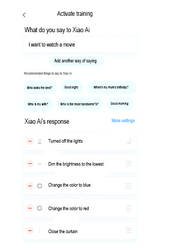 See Fig. 10 for an example of Xiaomi smart speaker settings. Get started with voice control of your smart home by opening the ‘Xiaoxia App’ and activating the training mode. Initialize using “I want to watch a movie” as a voice command. Afterwards, add a command to the light and curtain motors to control the lights and curtains: shut them, dim the light above the coffee table, and convert the ceiling and TV cabinet light strips blue and red.
