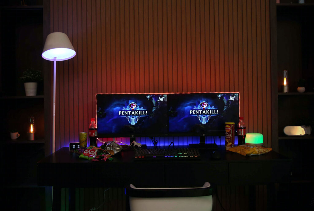 Players want to be immersed in the game’s world and experience its mood while they play. The use of RGB colored light in lighting design applications is best for generating a cool ambiance. Cool colors like blue, green, and purple should be used when creating a cool vibe. And if you look at the luminaires, you’ll see that gaming rooms tend to be decorated with a lot of light strips. This is because light strips’ linear impact might amplify the feeling of modernity. In addition, to establish the ambiance, gaming room light fixtures often include colored light strips behind the monitor.