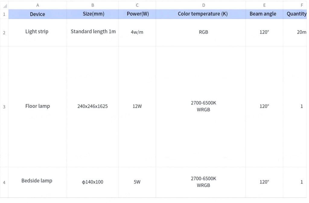The list of luminaires to be purchased is shown in Fig. 8. Additionally, smart curtains are an excellent investment if you’re looking for the best possible viewing experience. When you say “I want to watch a film” to the smart speaker, the smart curtain closes automatically and the smart lighting system turns on the “movie mode”. Even during the day, you can enjoy the same atmosphere as if you were sitting in a cinema.