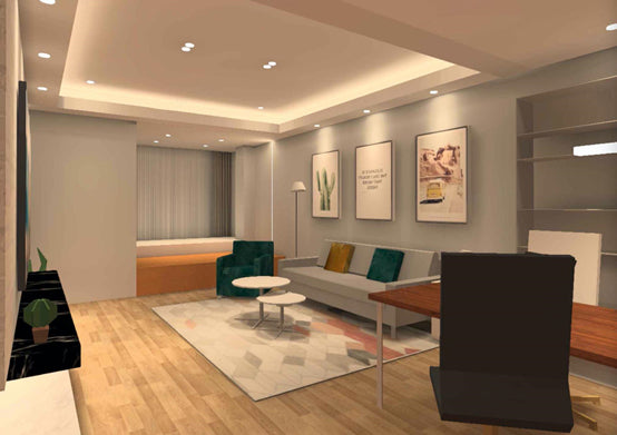Under the “meeting mode”, suitable color temperature and brightness may produce a cheerful and welcome atmosphere (see Fig. 4). Further, we may employ the zoning feature of the lamps to establish various brightness for different places, thus accentuating the layering of the room.