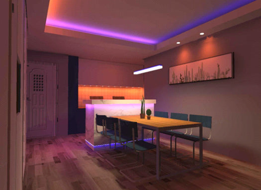 Why do restaurants dim light? If a couple wants to enjoy a romantic candlelight dinner or Western dinner at home, you can learn from the lighting design of the Western restaurant environment. Lower the overall restaurant ambient light (dim or turn off spotlights) and tune the chandelier above the dining table to a lower color temperature, the ceiling of the colored light strip can be adjusted to romantic purple to spice up the atmosphere (see Fig. 29).