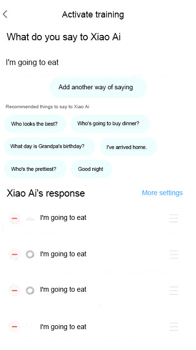 Open the Xiao Ai App and enable training as shown in Fig. 33 to see an example of Xiaomi smart speaker settings. To begin with, customize the voice control by adding commands such as “I’m going to eat,” “Start western dining mode,” and “Start bar mode”. After that, include control protocols in your device. The lights can be set to different modes based on the spoken instructions that are issued to the voice speaker.