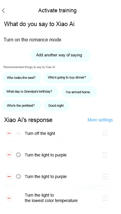 Fig. 38 Voice control commands and luminaire control rules for a welcoming mode (Image source: Xiao Ai app)